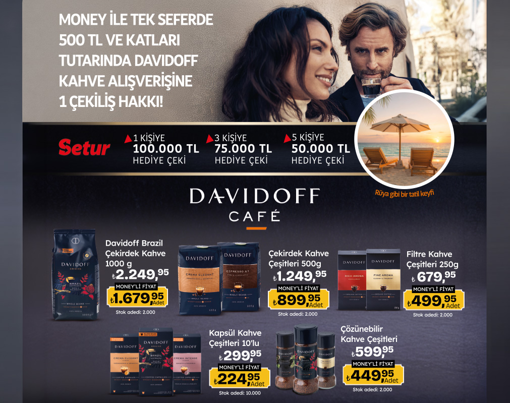 Bu kampanya Migros Ticaret A.Ş. tarafından Milli Piyango İdaresi Genel Müdürlüğü’nün 30.03.2026 tarihli ve E-58259698-255.01.02-88254 sayılı izni ile 16.04.2026 (00:01) - 13.05.2026 (23:59) tarihleri arasında gerçekleştirilecektir. Kampanya tarihleri arasında, Türkiye genelindeki tüm Migros, 5M Migros, Migrosjet fiziki Mağazaları’ndan, Migros Sanal Market veya Migros Hemen online Mağazaların’dan Tchibo Kahve Mam. Dağ. Ve Paz.Tic. Ltd. Şti.’ye ait Davidoff markalı kahve ürünlerinden birlikte veya ayrı ayrı tek seferde 500 TL ve katları tutarında (her 500 TL’ye bir çekiliş hakkı) alışveriş yapan Money veya Money Bonus üyesi müşterilere çekiliş hakkı verilecektir. Çekilişte 1 kişi 100.000 TL değerinde Setur Hediye Çeki; 3 kişi 75.000 TL değerinde Setur Hediye Çeki; 5 kişi 50.000 TL değerinde Setur Hediye Çeki ikramiyesi kazanacaktır. (Setur Hediye çekleri 31.12.2026 tarihine kadar Yurt içi ve yurt dışı paket turlarda, Yurt içi ve yurt dışı otel rezervasyonlarında; Gemi turlarında; Yurt içi ve yurt dışı uçak biletlerinde; Yurt dışı eğitim ve vize hizmetlerinde; Setur Select kişiye özel seyahat danışmanlığında geçerlidir. Hediye çekleri online alışverişlerde ve kurumsal alışverişlerde geçerli değildir. Hediye çekini talihliden başkası kullanamaz, nakde çevrilemez ve devredilemez. Hediye çeki yalnızca 444 28 22 nolu Setur çağrı merkezi ve Setur şubelerinde kullanılabilir nitelikte olacaktır.) Görseller temsilidir. Çekiliş 03.06.2026 tarihinde, saat 11.00’da Yeni Markera Çekiliş Org. ve Pro. Hiz. Tic. Ltd. Şti. Kuştepe Mah. Mesut Cemil Sok. No: 30/1 Şişli/İstanbul adresinde bulunan konferans salonunda noter huzurunda, isteyen herkesin katılımına açık olarak gerçekleştirilecektir. Kazanan talihliler 05.06.2026 tarihli Birgün Gazetesi Türkiye baskısında duyurulacaktır. Asil ve yedek talihlilere taahhütlü posta yolu ile tebligat yapılacaktır. Postada meydana gelen gecikmelerden Migros Ticaret A.Ş. sorumlu tutulamaz. Kampanyaya sadece Money veya Money Bonus kart sahipleri katılabileceklerdir. Ad, soyad ve telefon no bilgileri eksik veya kayıtlı olmayan Money veya Money Bonus kart sahipleri müşterilere çekiliş hakkı verilmeyecektir. Migros Sanal Market veya Migros Hemen online siparişlerinde teslimat tarihinin en geç 13.05.2026 olması, yapılan alışverişin provizyona dönmesi ve teslimat sırasında Davidoff markalı kahve ürünlerin net ödeme tutarının 500 TL olması gerekmektedir. Siparişlerde hediye çeki, kampanya, banka puanı kullanımı gerçekleştiği takdirde net ödeme tutarı 500 TL olmalıdır. 500 TL altında kalan siparişler dahil edilmeyecektir. Bir kişi birden fazla ikramiye kazanamaz. Katılımcının ikramiye kazanması durumunda adres bilgileri eksik veya bilinmiyor ise gazetede yapılan ilan tebliğ için yeterli olacaktır. Kampanya tarihleri arasında alışverişlerini iptal veya iade eden müşterilerin çekiliş hakları iptal edilecektir. Bu çekilişe Migros Ticaret A.Ş., Tchibo Kahve Mam. Dağ. Ve Paz.Tic. Ltd. Şti. ve Yeni Markera Çekiliş Org. ve Pro. Hiz. Tic. Ltd. Şti. çalışanları ile 18 yaşından küçükler kampanyaya katılamaz, katılmış ve kazanmış olsalar bile ikramiyeleri verilmez. Kazanılan hak devredilemez, nakde veya mala çevrilemez. Money veya Money Bonus kart üyelik bilgilerinin güncelliği, doğruluğu, yeterliliği ve ispatı katılımcıların sorumluluğundadır. KDV ve ÖTV dışında ikramiye ile ilgili tüm vergiler ve yasal yükümlülükler talihlilere aittir. Kampanya ile ilgili ayrıntılı bilgili için www.money.com.tr internet adresini ziyaret edebilirsiniz. Bu çekilişe katılan herkes, yukarıdaki şartları kabul etmiş sayılır. Görseller temsilidir.