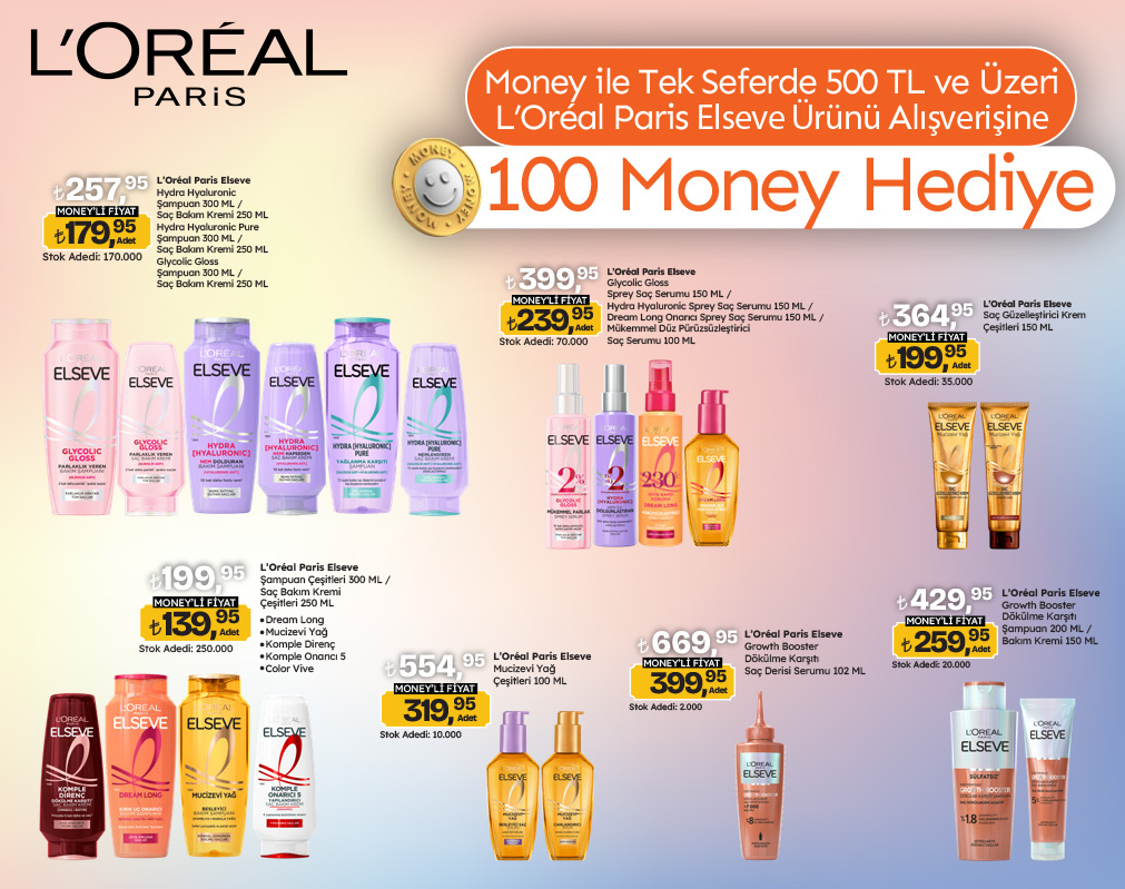 12-25 Mart 2026 tarihleri arasında Migros, 5M Migros, Migros Jet mağazalarından, Migros Sanal Market’ten veya Migros Hemen’den Money ve Money Bonus ile yapılacak tek seferde 500 TL ve üzeri Loreal Paris Elseve saç bakım ürünü alışverişine 100 Money hediye edilecektir. Kazanılan Money’ler 2 gün içerisinde yüklenecek ve 30 Haziran 2026 tarihine kadar kullanılabilecektir. Kampanyadan yalnızca Money ve Money Bonus üyeleri yararlanabilir. Yeniden satış amaçlı toplu satın alımlar (kampanyaya dahil bir ürünün bir fişte 15 adet ve üzerinde satın alınması) ve eksik ve yanlış bilgi paylaşılmış Money üyeleri kampanya kapsamına dahil değildir. Kampanya, Money özellikli Yat Kart ve Otel Restoran Kartlarda geçerli değildir. Bir müşteri bir kampanyadan en fazla 5000 Money kazanabilmektedir ve 1 Money 1 TL değerindedir.