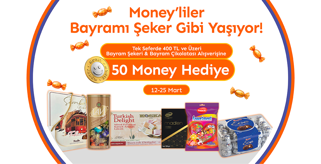 12-25 Mart 2026 tarihleri arasında Migros, 5M Migros, Migros Jet, Migros Hemen veya Migros Sanal Market'ten kayıtlı Money ile tek seferde 400 TL ve üzeri Bayram şekeri ve Bayram çikolatası alışverişine 50 Money hediye edilecektir. Kampanyaya Money Mobil uygulamasından kayıt yapılabilir. BAYRAM yazıp 5818'e SMS göndererek ya da kasiyere kampanya kaydı talebi iletilerek de kampanyaya kayıt yapılabilir. Kampanyadan en fazla 2 kere yararlanılabilir. Bayram şekeri ve Bayram çikolatası kampanyasına dökme ve paket ikramlık çikolatalar, paketli lokumlar, paketli ikramlık drajeler, ikramlık şekerler dahildir. Cezerye, pestil, fitil cevizli sucuklar ve Migros markalı ürünler kampanyaya dahil değildir. Kazanılan Money'ler 2 iş günü içinde karta yüklenecek ve 30 Haziran 2026'ya kadar Migros, 5M Migros, Migros Jet, Macrocenter, Mion, Migros Petimo, Migros Hemen, Migros Sanal Market, Migros Yemek, Macroonline, Mion Online ve Petimo Online'da kullanılabilecektir. Money özellikli Yat Kart ve Otel Restoran Kartlarda geçerli değildir. Yeniden satış amaçlı toplu satın alımlardan ve aynı fişte aynı 15 adet ve üzeri ürün alımlarından Money kazanılamamaktadır. Eksik veya yanlış kişisel bilgi paylaşılmış Money üyelikleri kampanyaya dahil değildir.
