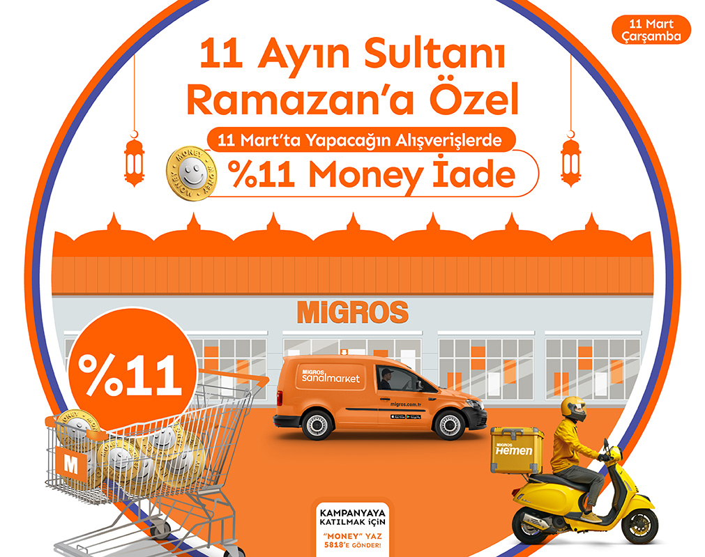 11 Mart 2026 tarihleri arasında Migros, 5M Migros, Migros Jet mağazalarından veya Migros Sanal Market, Migros Hemen?de kayıtlı Money özellikli kartlar veya Money Bonus kredi kartı ile yapılacak alışverişlerde geçerlidir. Kampanya kapsamında yapılan her alışverişin %11?i tutarında Money iade edilecektir. Bir müşteri kampanyadan maksimum 1.000 Money kazanabilecektir. Kazanılan Moneyler 2 iş günü içerisinde karta yüklenecek ve 30 Haziran 2026'e kadar kullanılabilecektir. Kampanya detayları Migros kasa fişleri üzerinden, Money mobil uygulamasından, Migros Mobil Uygulamasından, Çağrı Merkezinden, Money ve Migros web siteleri üzerinden takip edilebilir. Money üyeliğine bağlı GSM bilgisi, Money kart veya Money Bonus kredi kartı alışveriş öncesinde pos cihazından tuşlanmalıdır. Kampanya Money özellikli Yat Kart, Otel Restoran ve Servis Kartlarında geçerli değildir. Alışveriş harcama tutarına alkollü ürünler, sigara, operatör TL yükleme, altın ürünler, alışverişte kazanılan anında indirimler ve yeniden satış amaçlı toplu satın alımlardan ve aynı fişte aynı üründen 15 adet ve üzeri alımlar dahil değildir. Kampanyaya kayıt zorunluluğu bulunmaktadır. Kampanyaya katılmak için Money Mobil Uygulaması üzerinden veya MONEY yazıp 5818'e SMS atılması veya kasiyere kampanya kayıt talebinin iletilmesi gerekmektedir. SMS gönderimleri her müşterinin kendi tarifesi üzerinden ücretlendirilecektir.