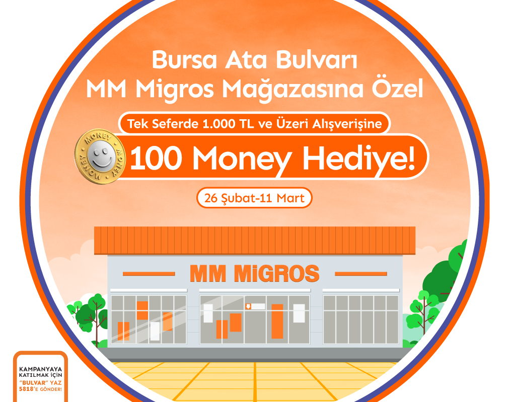 26 Şubat – 11 Mart 2026 tarihleri arasında Bursa Ata Bulvarı MM Migros mağazasından yapacağın kayıtlı Money veya Money Bonus ile tek seferde 1.000 TL ve üzeri alışverişine 100 Money hediye edilecektir. Kampanyaya BULVAR yazıp, 5818'e SMS göndererek ya da kasiyere kampanya kayıt talebi iletilerek kayıt yapılabilir. Alkol, sigara, TL yükleme, elektrikli-elektronik ürünler, yılbaşı sepeti, Ramazan Kolisi, Milli Piyango bileti, Kurban ve altın alımı dahil değildir. Kazanılan Money’ler 2 iş günü içinde karta yüklenecek ve 30 Haziran 2026'ya kadar Migros, 5M Migros, Migros Jet, Macrocenter, Mion, Migros Petimo, Migros Hemen, Migros Sanal Market, Migros Yemek, Macroonline, Mion Online ve Petimo Online’da kullanılabilecektir. Kampanyadan en fazla 1 kere yararlanılabilir. Money özellikli Yat Kart ve Otel Restoran Kartlarda geçerli değildir. Yeniden satış amaçlı toplu satın alımlardan ve aynı fişte aynı 15 adet ve üzeri ürün alımlarından Money kazanılamamaktadır. Eksik veya yanlış kişisel bilgi paylaşılmış Money üyelikleri kampanyaya dahil değildir.